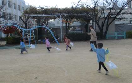 幼稚園の子どもたちがたこあげを楽しんでいる様子を見た