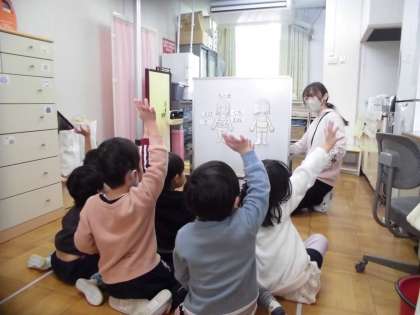 始めに体クイズをして一つ一つの部位の名前を子どもたちが答えた後、プライベートパーツを知らせました。4月の4歳児訪問事業でも話があったので「だいじだいじどーこだ?」の絵本を見て振り返りをしながら、プライベートパーツはとても大切だと改めて伝えました。