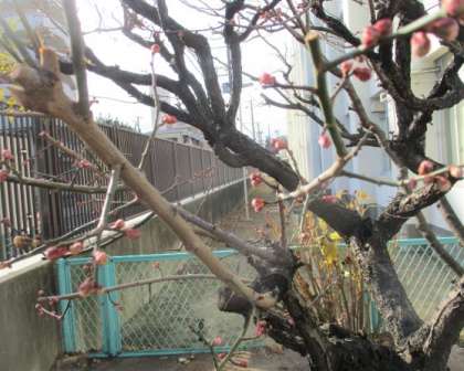 園門前の梅のつぼみが日差しの暖かさを感じて