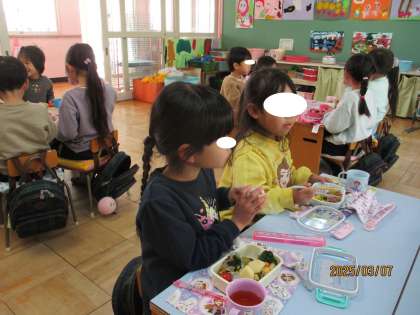 4歳児、5歳児のペアーでお弁当を食べて