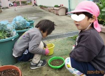 園庭では・・・ 公開日 2025/03/12 更新日 2025/03/12 幼稚園日記 4歳児・5歳児の子どもたちは 毎日元気いっぱいです。 園庭では、 ぬかるんだ土を見つけて泥んこをしたり、 草花の近くで虫探しを始めたりと、 春の陽気を楽しんでいました。 「見てみて!乗れるようになったよ」 真剣な表情で一輪車に取り組んでいる子もいます。 暖かい気候の中、 園庭での遊びを存分に楽しんでいました。 いいね(0)