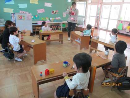 養護教諭が手本を見せながら、音楽に合わせて子どもたちと一緒に歯みがきをしています。音楽は「みがきのみかた」です。日に日に磨く場所を覚え始めているので、お家でもぜひしてみてください!