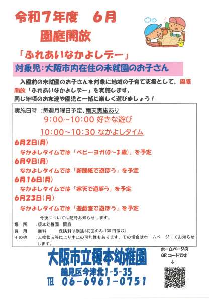 ふれあいなかよしデーのお知らせ 公開日 2025/05/15 更新日 2025/05/15 幼稚園日記 6月の園庭開放「ふれあいなかよしデー」のお知らせです。 事前予約は必要ありません。 初回のみ保険代130円いただいております。 ぜひ遊びに来てください。 いいね(0)