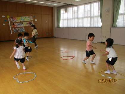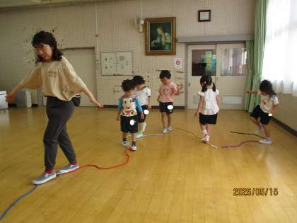 縄あそびって楽しいな 公開日 2025/05/15 更新日 2025/05/15 幼稚園日記 5歳児は縄を使っていろいろなことに挑戦しました。 縄跳びって跳ぶだけじゃないよ!もっと親しみをもって 楽しめるようにおひっこしゲームや、つなわたりなどをして遊びました。 一番盛り上がった遊びはおひっこしゲームでした。 みんな汗だくになって楽しく縄あそびをしていました。 いいね(0)