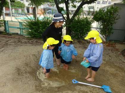 今日も良いお天気だったので、子どもたちは裸足になって色水遊びや泥んこ遊びを楽しみました。色水遊びでは、赤や黄色の色水を混ぜてジュースをつくったり、何度もコップに入れたりしていました。泥んこ遊びでは、土山の真ん中に空いている穴に水を入れて、お風呂をつくっていました。「ここは深いね〜」と気持ちよさそうにしていましたよ。これからどんな楽しい遊びになっていくのか楽しみです。