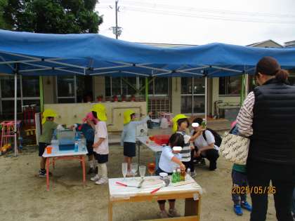 園庭で色水遊びをしたり、体操をしたりして在園児と楽しく遊びました。