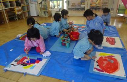 5歳児は昨日、鶴見消防署に行きました。今日は、みんなで絵の具で消防車や消防士さんの絵をかきましたよ。「消防士さんかっこよかったな」「運転席乗せてもらって嬉しかった」など、感じたことをつぶやきながら丁寧にかく姿が見られました。