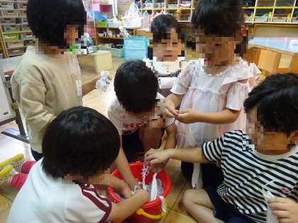 また、トイレットペーパーを使って『紙粘土』をつくると「なにこれ〜気持ちいい!」と、感触を楽しんでいましたよ。いろいろな遊びを経験し、楽しめるような保育をしていきたいと思います。