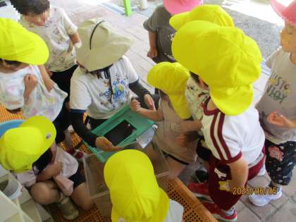 みんなで育てていたアオムシがチョウチョになりました。6月になってから毎日のようにチョウチョが生まれ「毎日チョウチョのお誕生日だね」と喜んでいました。また生まれるのが楽しみですね。