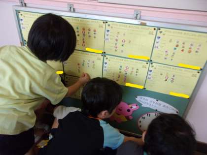 「今日は5時に起きたよ!」「昨日の夜は9時ギリギリだった」「朝ごはんは毎日食べてるから毎日シール貼れる!」と嬉しそうにシールを貼る姿が見られたり、時計の掲示物を使いながら時間を知らせてくれたりしました。