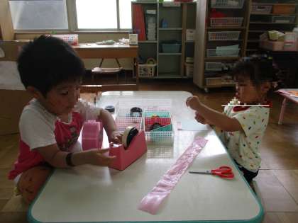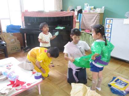 作って遊ぶの楽しいね! 公開日 2025/06/09 更新日 2025/06/09 幼稚園日記 4歳児クラスでは、いろいろな素材を使って作ることを楽しんでいます。 カラーポリ袋やスズランテープが服やベルトなどに変身!! 「○○が作りたいねんな」「これ着て遊ぶねん!」 と、作ったものを使ってお店屋さんごっこにも使って遊んでいます。 ビニールテープで模様をつけたりと、自分だけの服が完成しましたよ! いいね(0)