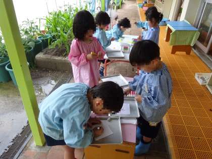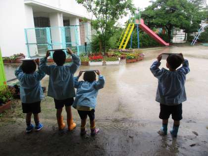 今日は朝から雨でしたが、子どもたちは「雨の魔法できるね」と目を輝かせていましたよ。前回はコーヒーフィルターに模様をかきましたが、今日は奉書紙にかきました。雨があたるように、頭の上にのせてみるなど工夫している姿が可愛らしかったです。雨の日の楽しみ方を知った子どもたちです。
