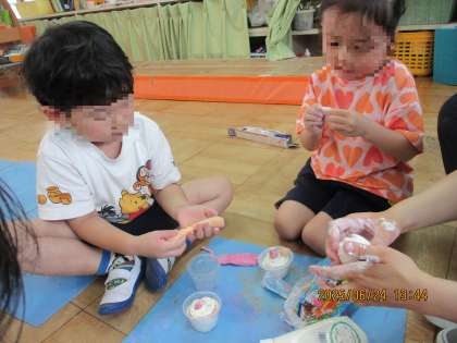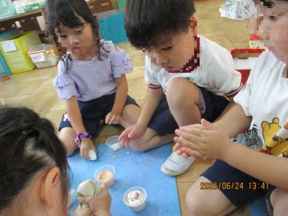 5歳児がつくっている商店街ごっこにパフェ屋さんがあります。今日は、紙粘土を使って新作のパフェやプリンができましたよ。紙粘土に絵の具を混ぜると色が変わり「すごーい!」「なんで変わったの?」と驚いていました。ホイップ粘土も使って、美味しそうなパフェがたくさんできました。「次はもっといろんな味のパフェつくりたいな」と言っていたので、どんなパフェができるか楽しみですね。