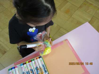 お花紙をふんわりと袋に入れる子、ぎゅっと握って入れる子