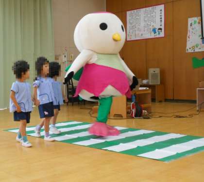 今日は、区役所の市民協働課の方に交通安全指導をしていただきました。分かりやすくDVDやパワーポイントを使ってお話をしてもらい、子どもたちもよく分かったようです。最後に、つるりっぷと一緒に横断歩道を歩いてみましたよ。教えてもらったことを守っていきましょうね。