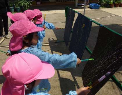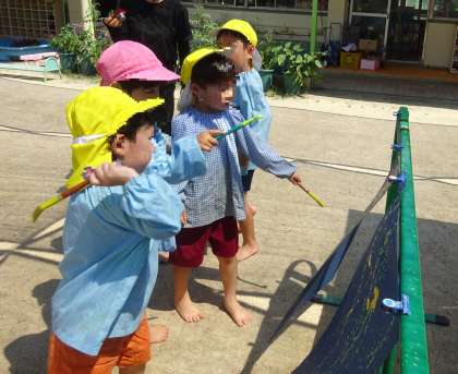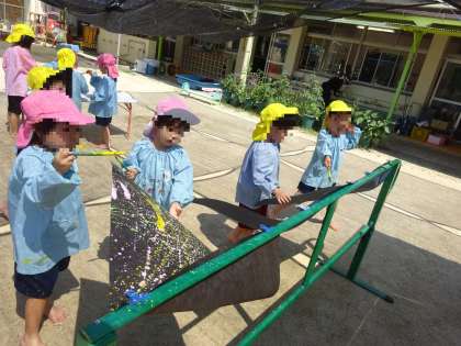 今日は、全園児で絵の具遊びをしました。4歳児は「やってみたい〜」と言っていたので、大喜びでした。前回の経験もあり、思い切り腕を振る様子が見られました。この紙がなにに変身するでしょう…お楽しみに!