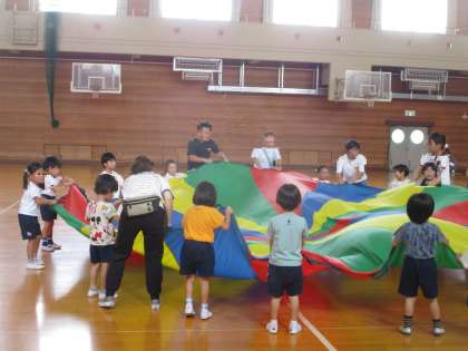 今日は、近隣の汎愛高校に行きました。門の前で、校長先生や先生方が待ってくださっていて、温かく迎えてくださいました。広い体育館に入ると「わー!広いね」と思わず走り出す様子が見られました。みんなで体操をして、だるまさんがころんだや鬼ごっこをして遊びました。パラバルーンもできて大喜びでしたよ。