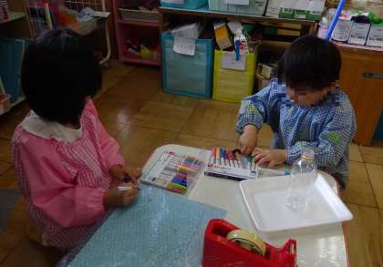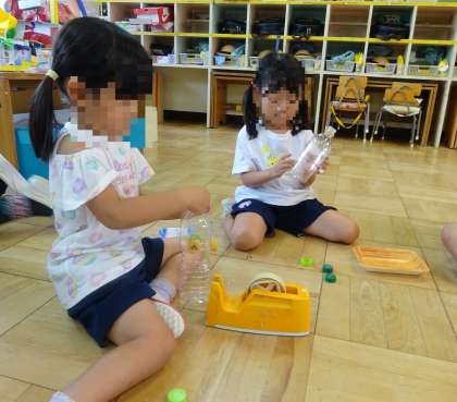 プール遊びを楽しむ中で、5歳児が「なにか浮かべてみたい!」と話になり、素材を使って、船やクラゲなど一人一人が「浮かぶもの」を考えてつくりました。プール遊びの時に浮かべてみると…「浮かんだ!」「重いものだとどうなるのかな〜」など、気付いたことをつぶやいていましたよ。つくったものをまた変化させて遊びを楽しんでいきたいと思います。