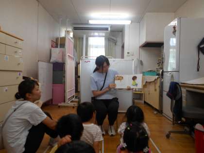 始めに「はみがきれっしゃ」の絵本を読み、列車に乗ってきたミミちゃんと一緒に歯みがきをする大切さを知らせました。