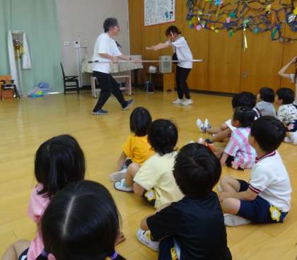 今月の避難訓練は不審者が来た時を想定して行いました。いつもとは違う避難方法でしたが、子どもたちは静かに落ち着いて避難する様子が見られました。事業担当主事さんから”さすまた”の使い方を教えてもらいましたよ。