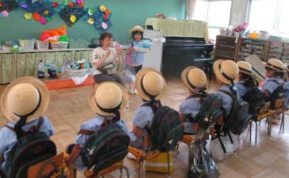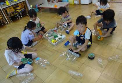 今日も良いお天気で、気持ちよくプール遊びを楽しみましたよ。5歳児は明日のプール遊びで使えるように「自分のビート板」をつくりました。「これで浮かぶかな〜」「ロケットみたいにしたからシューっていくよ」など考えたことを話していましたよ。明日のプールが楽しみですね。