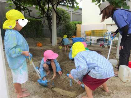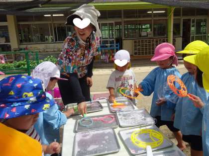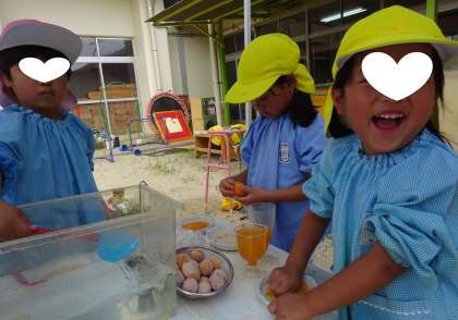 夏のあそびは 公開日 2025/07/11 更新日 2025/07/11 幼稚園日記 今日も園児とちゅーりっぷクラブさんが、 一緒に園庭で遊んでいます。 どろんこ遊びに、シャボン玉遊び、 ジュース作りには園で収穫して凍らせておいた 梅の実を使っていて、いい色・いい香りです。 「先生見てて」「こっち来て」 嬉しいことや楽しいことがいっぱいで 見て欲しいこともいっぱいです。 異年齢でお互いに刺激し合って過ごす、 榎本幼稚園らしい夏のあそびです。 いいね(0)
