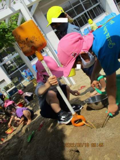 園庭での集会と友達と楽しんでいる遊びの姿を、5歳児の保護者の方に保育参観して頂きました。色水作りを見ていた保護者の方は「迎えに来た時に見せてくれる色水はこうして作ってるんですね」と驚いて見ておられました。