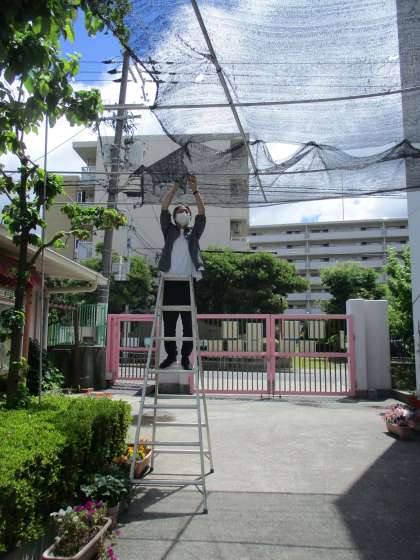 園門前に斜光ネットを設置しました。過ごしやすくなりますように。