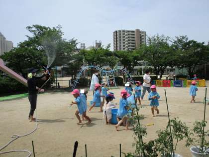 園庭で水鉄砲をして遊びました。先生がする大雨シャワーもいい気持ちでした。