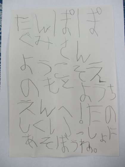 これは5歳児がお家で書いてきてくれたお手紙です。幼稚園に新しい友達が遊びに来てくれることを楽しみにしています。7月から2歳児の園庭開放がスタートします。当日は水鉄砲やスーパーボールすくいなど水遊びを予定しています。汚れても良い服装でお越しください。