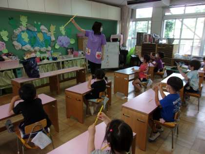6月は、正しいお箸の持ち方について話をしました。始めに一人一人にお箸を用意し、教師と一緒に正しいお箸の持ち方の確認をしました。