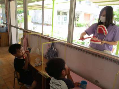 幼稚園では、新型コロナウイルス感染症対策をしながら歯みがきを実施しています。教師が歯の模型と歯ブラシを使って、正しい歯のみがき方を伝えながら少人数ずつしています。「みがきのみかた」という音楽を使いながら歯みがきをしているので、子どもたちは楽しみながら歯みがきをしている姿が見られました。
