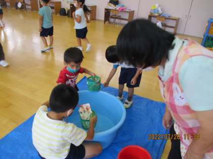 遊戯室で「魚釣りごっこ」をして遊びました。手作りの魚を使って楽しんでいます。