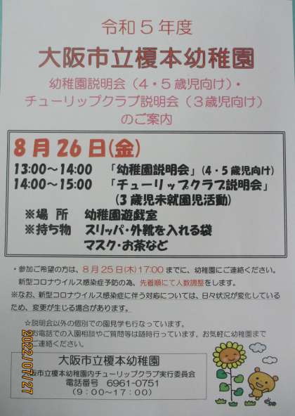 8月の説明会について 公開日 2022/07/27 更新日 2022/07/27 お知らせ 8月26日(金)「幼稚園説明会」と「チューリップクラブ説明会」(3歳児未就園児活動)を感染予防に努めながら実施します。保育内容・費用等についてお知らせします。園内見学も行いますので是非お越しください。 いいね(0)