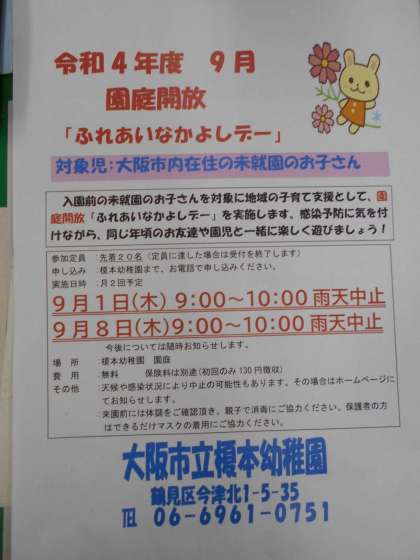 9月 園庭開放について 公開日 2022/08/25 更新日 2022/08/25 お知らせ 0歳から入園前のお友達まで参加して頂けます。幼稚園の園庭で同じ年頃のお子さんと一緒に遊びましょう。事前の申し込みは幼稚園までお願いします。 いいね(0)