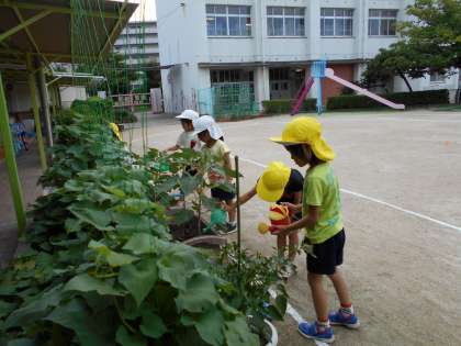 園庭に出ると子どもたちが水やりをしていました。野菜や草花の変化にも気づいています。