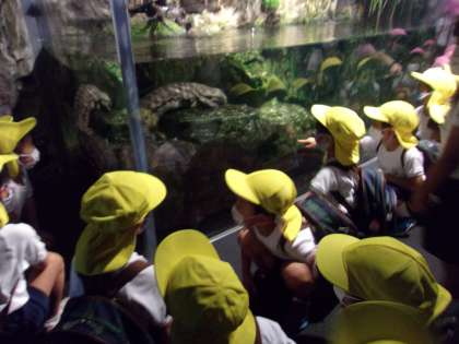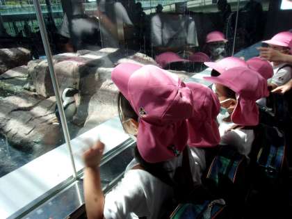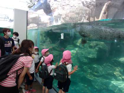 今日は子どもたちが楽しみにしていた園外保育に行きました。初めに「京都水族館」に行って海の生き物達に沢山会いました。ペンギンやアザラシ・お魚が近くに見えて大喜びでした。