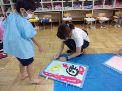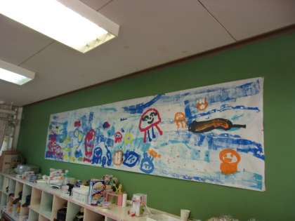 4歳児の保育室を覗くと「見て、クラゲかいたよ」と教えてくれました。担任は「それでどうなったの?」と優しく声をかけながら、一人一人の絵に込められた思いを聞き取っています。保育室の壁にはクラス皆でかいた絵が飾られています。
