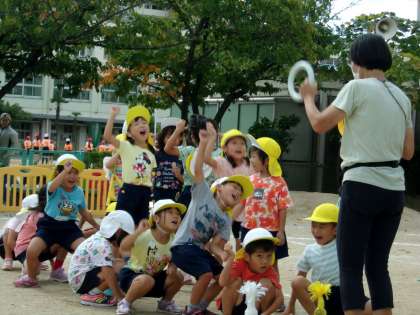 5歳児は「リズム演技」と「リレー」をしました。友達と力を合わせて頑張る姿が見られました。今年度は榎本幼稚園の創立50周年記念運動会です。当日はオープニングセレモニーも予定しています。お楽しみにしてください。