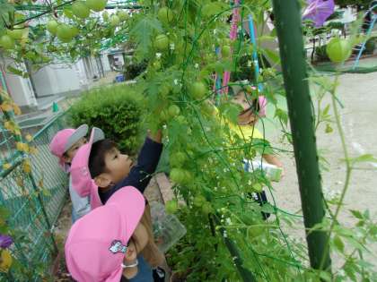 園庭で4歳児がフウセンカズラの種取りをしています。「あのね茶色いのが大丈夫なんだよ」「緑はまだ駄目」と、どの色の袋に種が出来ているのか知らせあっています。「あっ3つ入ってた」と数にも気づき大切そうに牛乳パックに集めています。