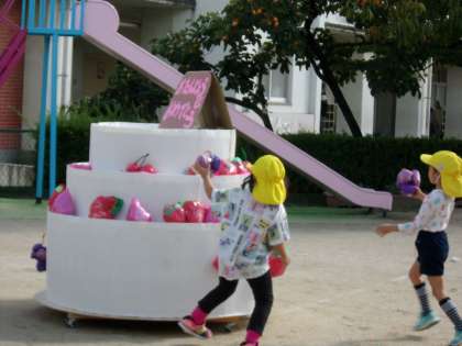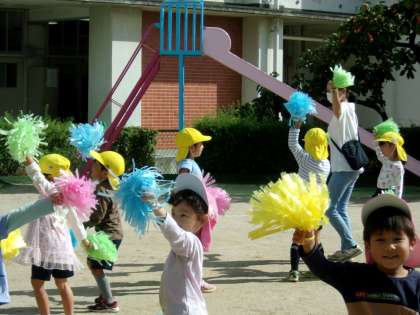 今日の園庭では。 公開日 2022/10/18 更新日 2022/10/18 幼稚園日記 4歳児がした運動会の演技を5歳児も一緒にやってみました。お互いの演技に興味をもっていたのでとても楽しそうでした。 いいね(0)