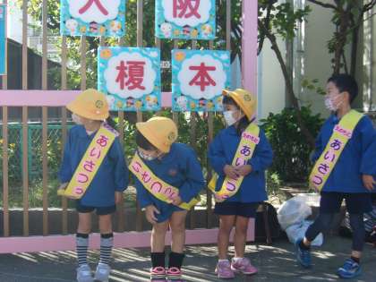 5歳児が園門に立ち挨拶当番をする「えのもとあいさつっこ」が始まり、元気な「おはようございます」の声が響いています。斜めにかけたたすきが可愛いですね。
