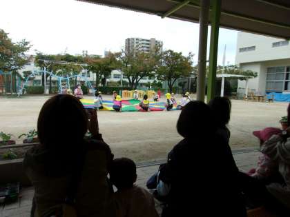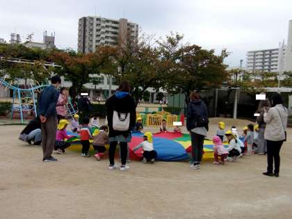 5歳児の子どもたちは、運動会でしたパラバルーンの演技を見せてあげた後、小さいお友達を誘って一緒にパラバルーンを楽しみました。優しく持ち方や技を教えてあげると小さいお友達もにこにこ笑顔でした。また一緒に遊ぼうね。