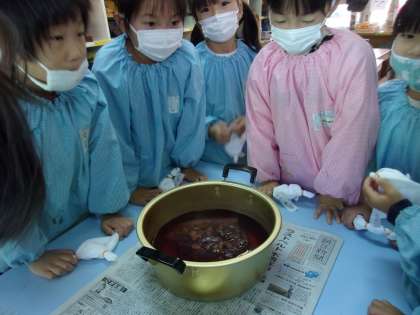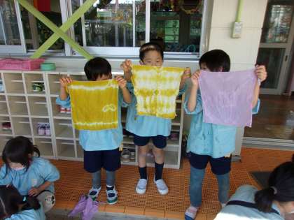 5歳児が染め物遊びをしました。布を輪ゴムで縛り、煮出したマリーゴールドやブドウの液に浸しました。わくわくしながら染まった布を広げてみると、「きれい!」「見て、丸の模様になってる!」と友達と見せ合って大喜びでした。