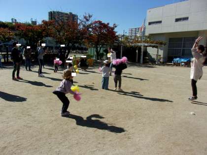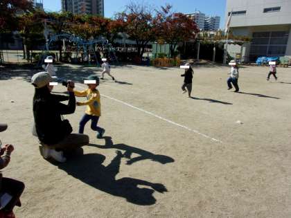 昨日はチューリップクラブの子どもたちが園庭でかけっこをしていました。ゴールは大好きなお家の人!一直線に走っていきました。