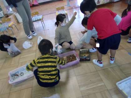 鶴見緑地公園でたくさん拾ったドングリを持ってきました。改めてじっくり見てみると、「長細ドングリ」「割れてるドングリ」「ドングリの帽子がさくらんぼみたい」と面白い発見がいっぱい。友達や先生と一緒にドングリを大きさや種類別に分けていました。このドングリで何して遊ぼうを、楽しみですね。