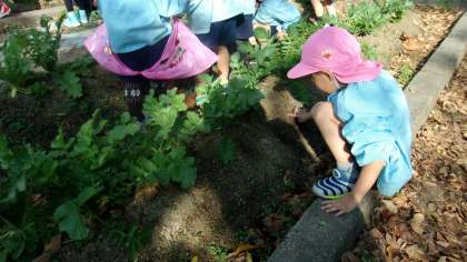 今日はぽかぽか陽気。「えのもとの森」へ行くと、「わあ!大根の頭が見えてる!」とみんなで葉っぱの下を覗いていました。雑草は抜いて、栄養たっぷりのお水をあげて、「おいしくなってね」と大根に声をかけていました。収穫が楽しみです。