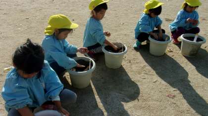 園庭では、チューリップの球根を植えました。何色の花が咲くかな。きれいに咲くころには、春ですね。