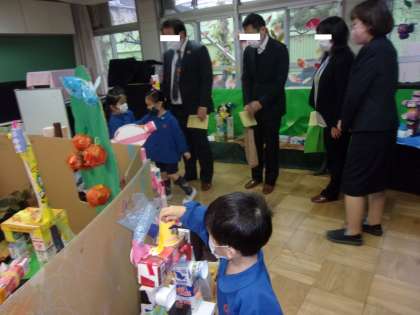 29日、未就園児のお友達や鶴見区役所から鶴見区長さんはじめ関係者の方々が来られ、こども展覧会の展示を見てくださいました。「これはぼくがつくったんだよ」「こっちも見て」と子どもたちは張り切ってご案内し、自分たちの作品を説明していました。