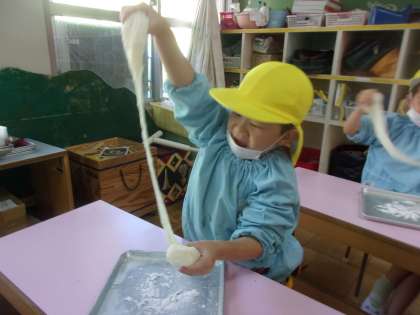 全園児でもちつきをした後、教師が大きな鏡餅を手早く丸めました。その後子どもたちも自分の鏡餅を丸めました。温かくてよく伸びるおもちをいつまでも触っていたい子どもたちでした。
